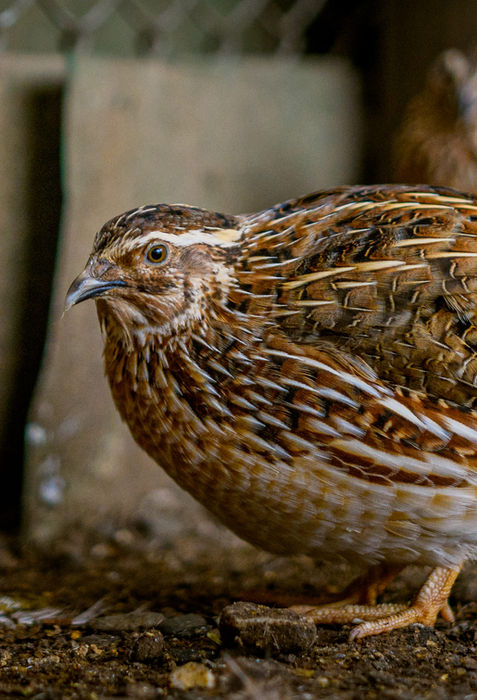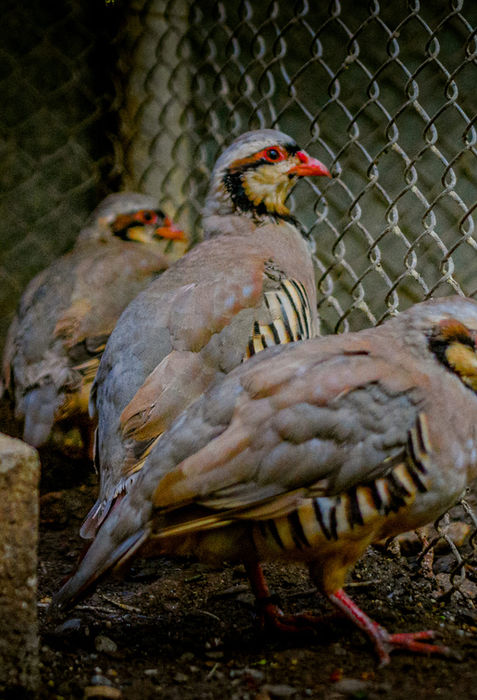 Small but robust bird weighing between 1.32 to 1.76 Lb. The male is larger than the female. Its plumage is brown with a black stripe that simulates a mask and tie that crosses the eyes and forehead reaching the chest. They feature distinctive black stripes on the sides of the body. It feeds on seeds, sprouts and herbs. They naturally inhabit rocky slopes and sparse undergrowth.