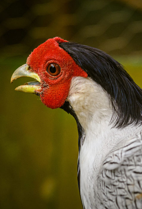Medium-sized bird that has a very long tail and can measure up to 125 centimeters in length. They present a marked sexual dysmorphism, the male has a white body and tail with black stripes, with a dark blue, almost black chest and ventral part of the body. Around the eyes they have intense red areas without plumage. The female is brown in color and the ventral part and the tail are streaked with white, brown and black. They are omnivorous animals, feeding on seeds, grains, berries, fruits, flowers, leaves and insects.