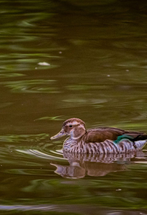 Also called a collared duck, it can weigh 370 gm in the adult stage, the female can measure between 25 and 30 cm in length and the males between 30 to 35 cm in length, the male has a black band on the crown and the part dorsal neck and female is more brown, with white head and neck spots. They inhabit streams, ponds and flooded lands, nest in hollows in trees, lay 6 to 12 eggs, incubation takes 26 to 28 days and are incubated by the female. Their diet is made up of vegetables, grass seeds, grasses at the water's edge, crustaceans, mollusks, larvae and aquatic insects.