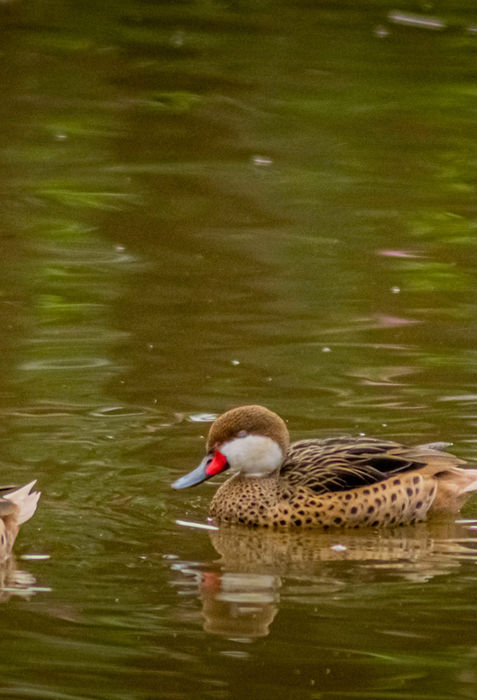 Their diet is mainly vegetable matter such as seeds of aquatic plants, algae, among others. They measure from 46 to 51 cm and can weigh 400 to 700 gm. The upper part of the head to below the eyes is brown, dotted with small black spots. The wing mirror is green and tan. They have a cream-colored tail. Its beak is bluish with a red base. The throat, cheeks and sides of the neck are white and the rest of the body is tan, the back is spotted and has black spots on the belly.